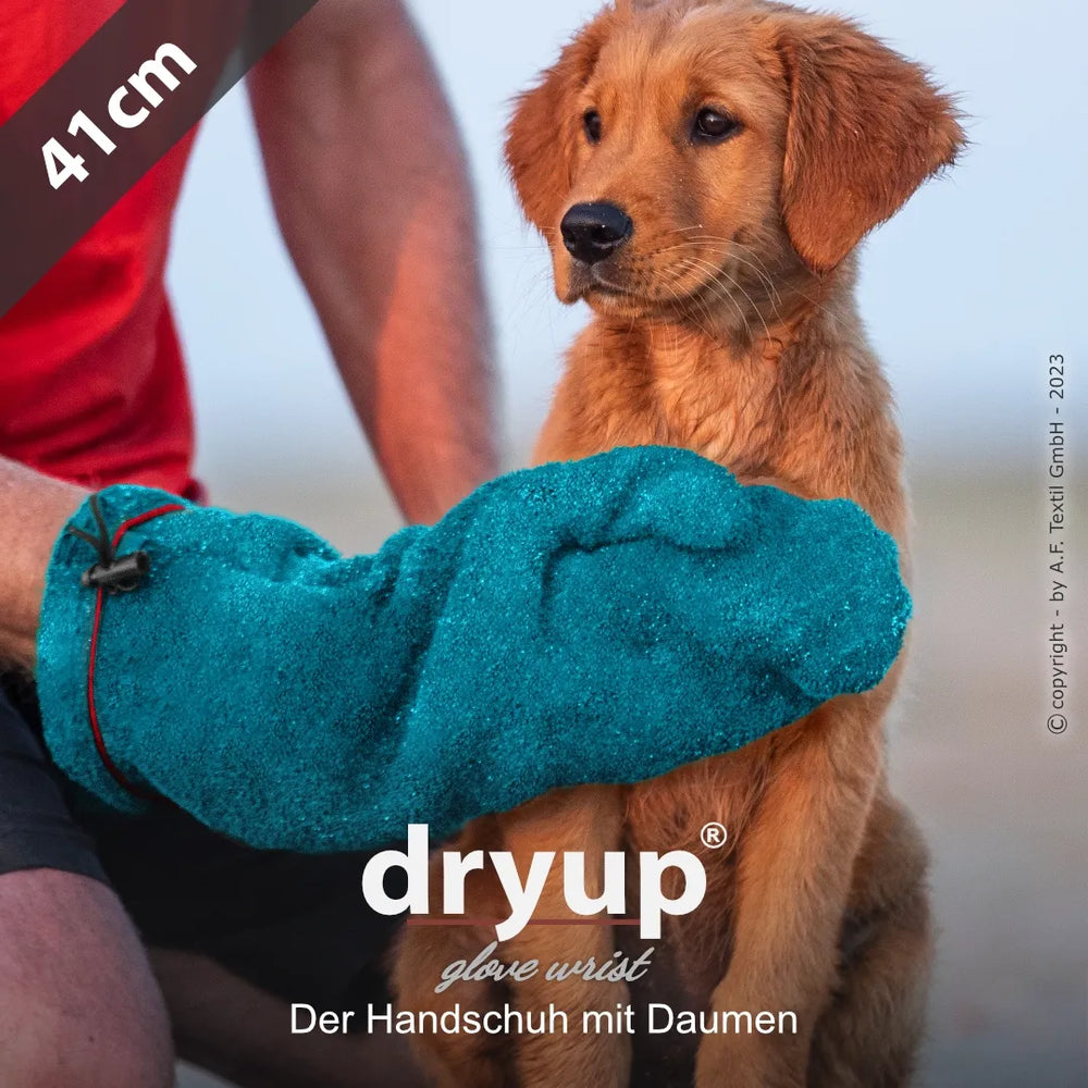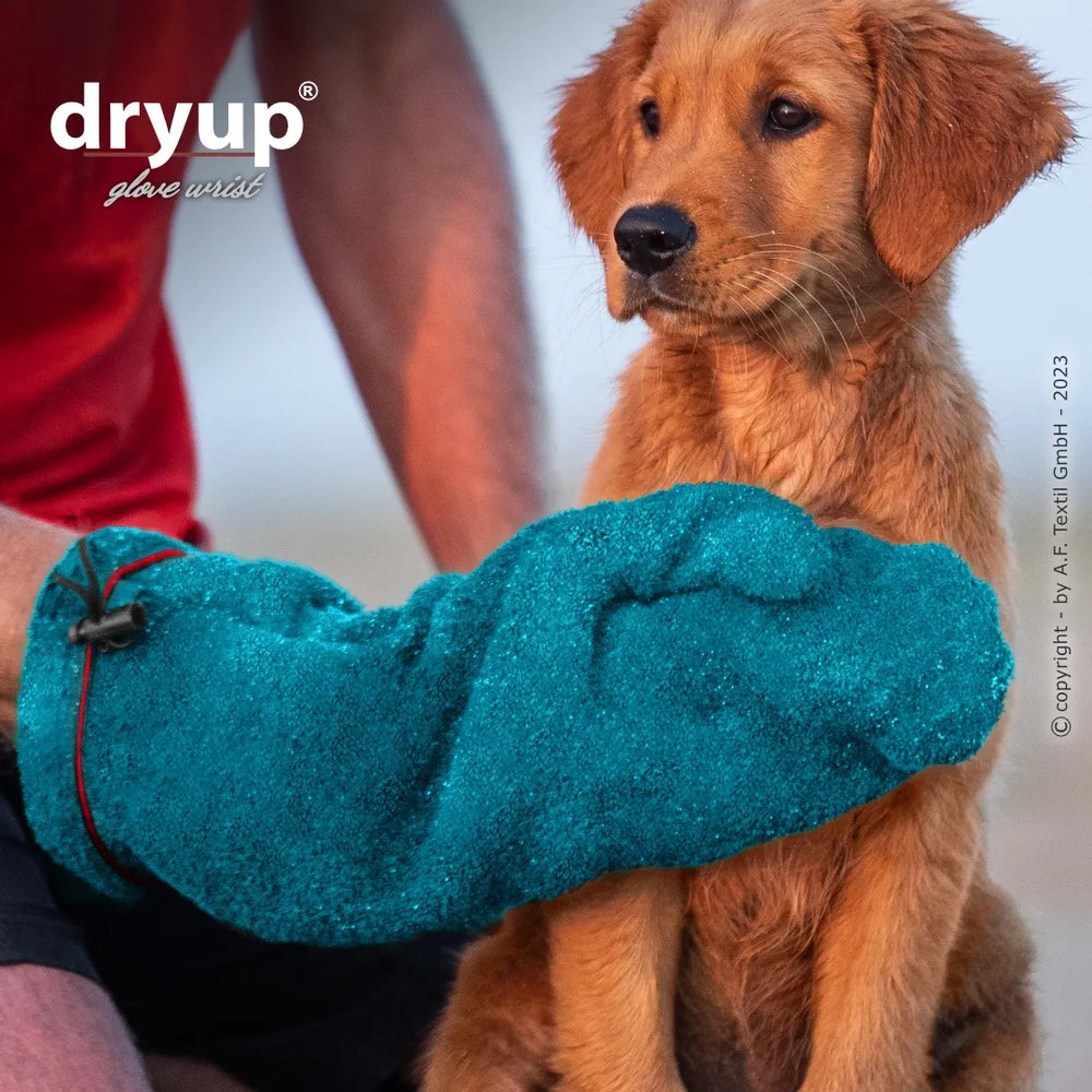Der dryup® Glove Wrist ist ein großer, bis zum Ellbogen reichender Frotteehandschuh aus 100 % Baumwolle. Er wurde speziell entwickelt, um Deinen Hund schnell, hygienisch und effektiv zu trocknen – ganz ohne direkten Kontakt mit nassem oder schmutzigem Fell.